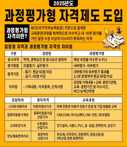과정평가형 자격이란 NCS(국가직무능력표준) 기반으로 설계된 교육훈련과정을 체계적으로 이수하고 내부 및 외부 평가를 거친 일정 수준 이상의 이수자가 취득하는 자격을 말한다. 즉, 단순히 시험을 보는 것이 아니라 실무 능력을 키우는 과정을 통해 자격증을 취득하는 방식입니다.