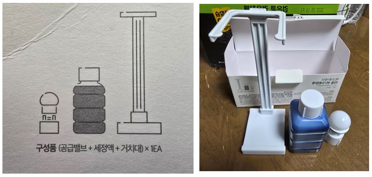세정제를 꺼꾸로 세우면 액체가 떨어지기 때문에 손에 장갑을 착용할 것을 권장합니다. 이 액체가 손에 묻게 됩니다. 세정제 입구에 가까운 순으로 물높이 상, 중, 하 인데 이에 맞게 거치대에 끼웁니다. 신속하게 물탱크 배수구 반대쪽에 거치대를 놓습니다. 그리고 변기물을 내려서 세정액이 나오는지 확인합니다. 세정액이 나올 때까지 1회~ 3회 물을 내립니다.