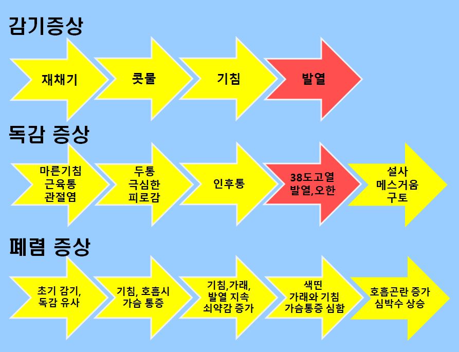 재채기, 콧물, 코막힘, 인후통, 기침, 미열 | 마른 기침, 고열, 오한, 피로감, 근육통 및 관절명, 두통, 인후통 | 기침 (가래 동반), 고열, 오한, 피로감, 호흡곤란, 흉통 |