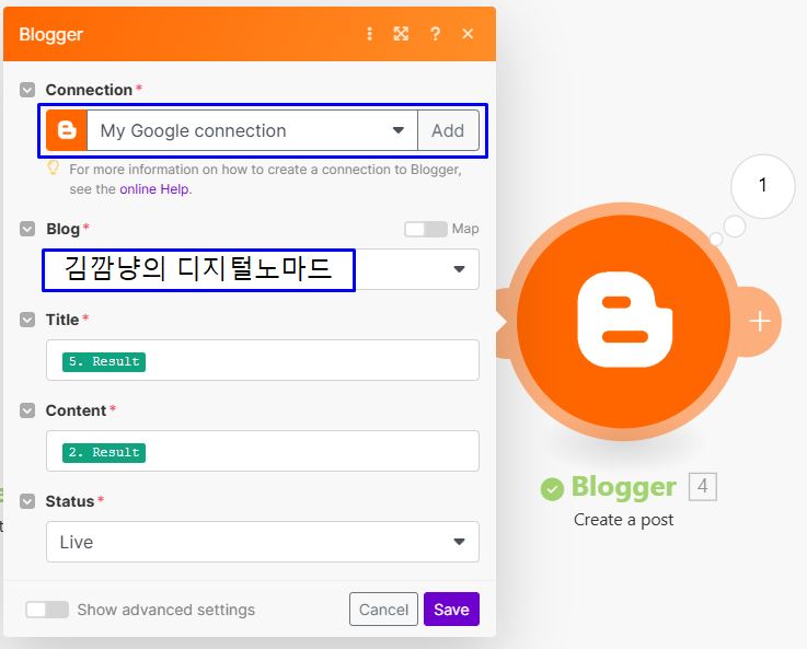 클라이언트 메이커 서버와 구글 블로그 스팟이 연동하여 활성화(activated)가 되지 않았습니다. 실제로 구글 이메일로 블로그 스팟을 연동하였는데 블로그 이름이 12시간 나타나지 않는 현상이 있었습니다. 시간이 경과하고 메이커와 블로그가 활성화가 되고 블로그 이름이 나타났을 때, 블로그 이름을 선택하고 실행(Run)하니까 블로그에 글이 작성되었습니다.