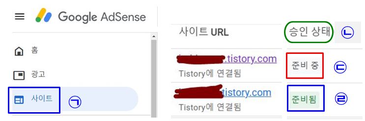㉣ '준비됨' 은 글자색이 초록색인데 블로그에 구글 광고를 게재할 준비가 되었다는 것입니다.