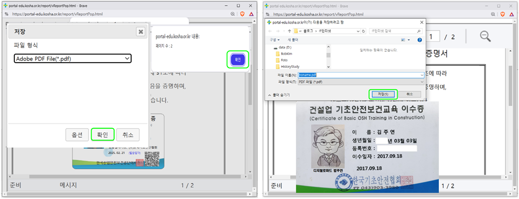 그러면 이수증 PDF 파을 저장할 폴더 창이 나타나면 원하는 폴더를 선택하고 파일을 저장합니다.