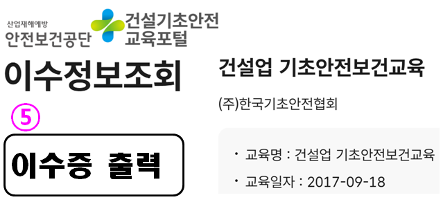 5.로그인을 하면 바로 '건설기초안전교육포털'-> 이수정보조회 결과 내용이 뜨거나 뜨지않으면 3.번 과정을 다시 진행하면 됩니다. 그리고 '이수증 출력' 아콘을 클릭합니다.