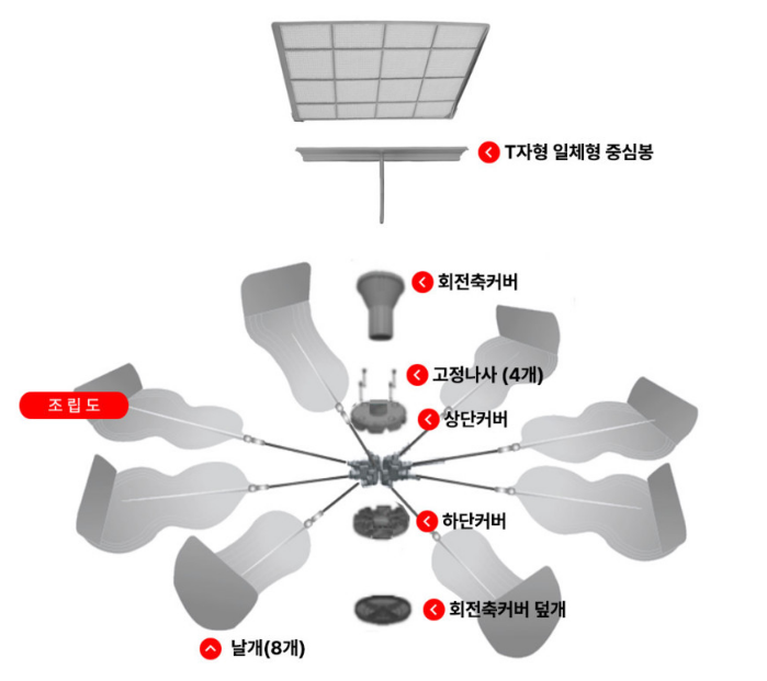 'T자형 중심봉'에 날개를 위로 끼우고 회전출 커버 덮개를 돌려서 튼튼하게 고정해준다.