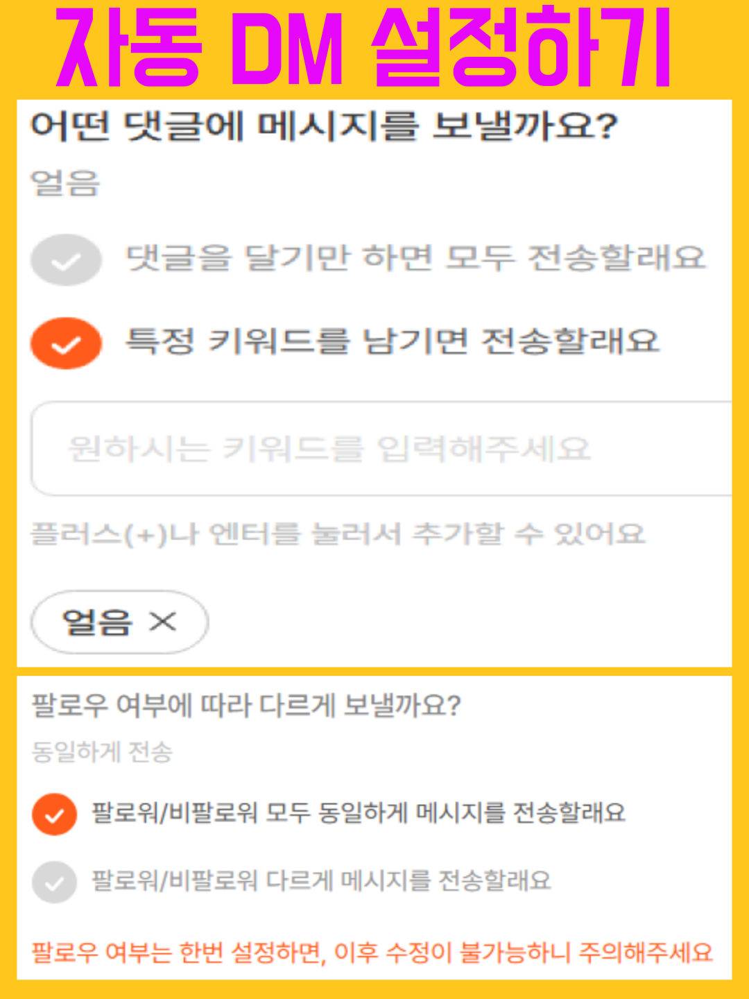 팔로우/ 비팔로워 메세지 선택할 수 있고요.