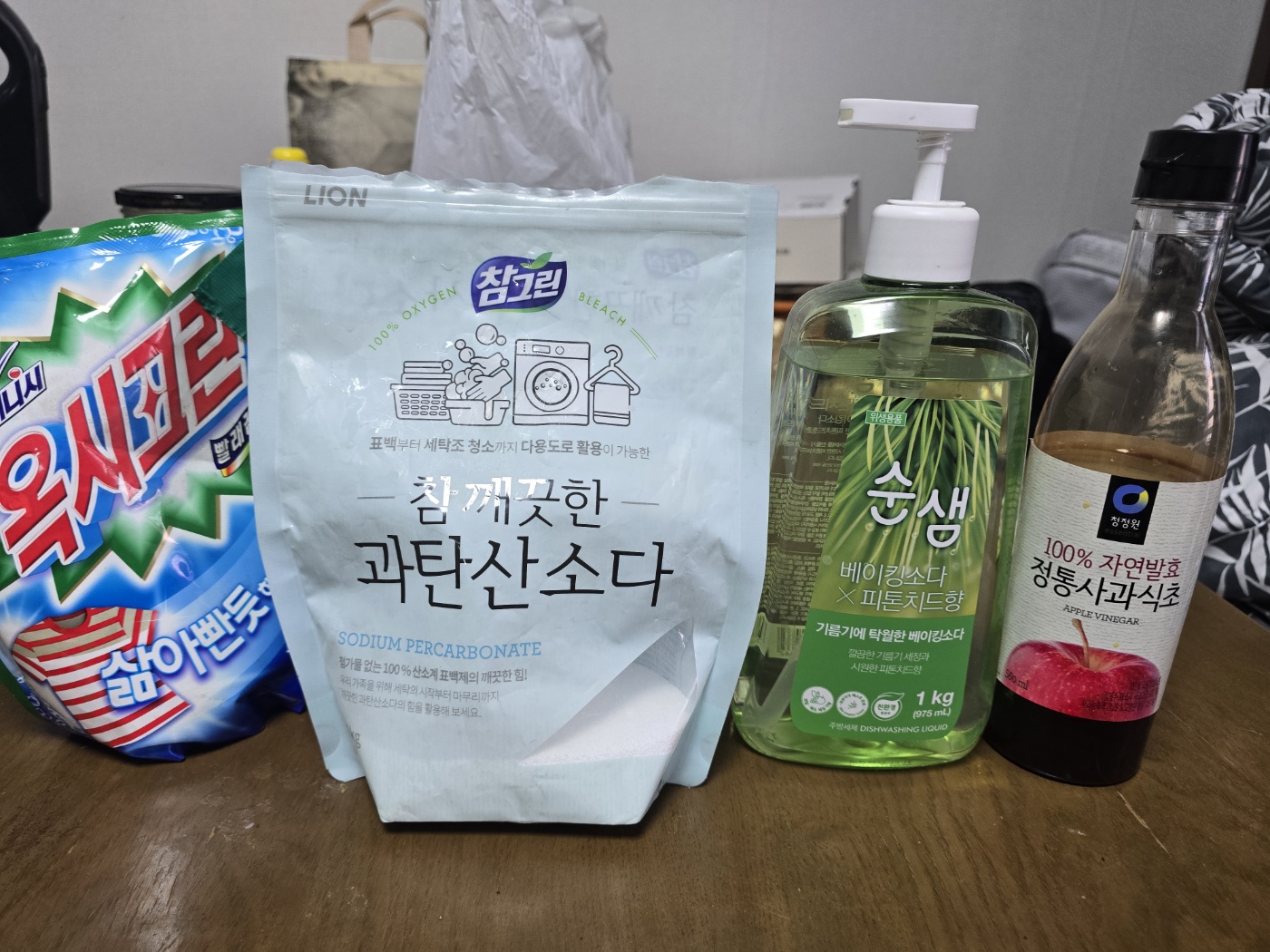 왼쪽부터 옥시크린, 과탄산소다, 베이킹소다, 식초 좋다는 건 모두 준비 완료!