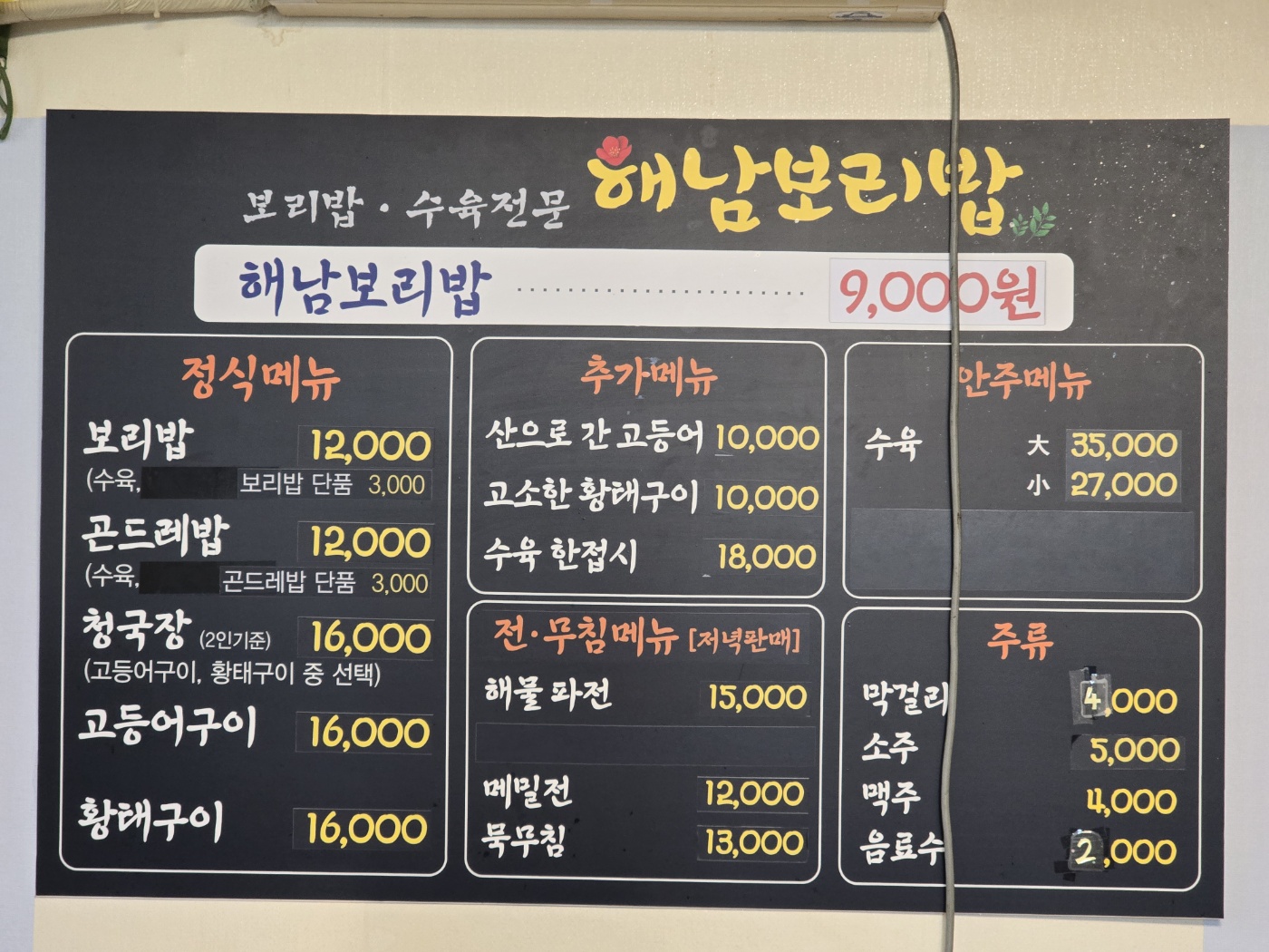해남보리밥은 보리밥 정식 중심이지만, 수육 전문 구성과 더불어 다양한 정식 메뉴도 함께 제공합니다.
