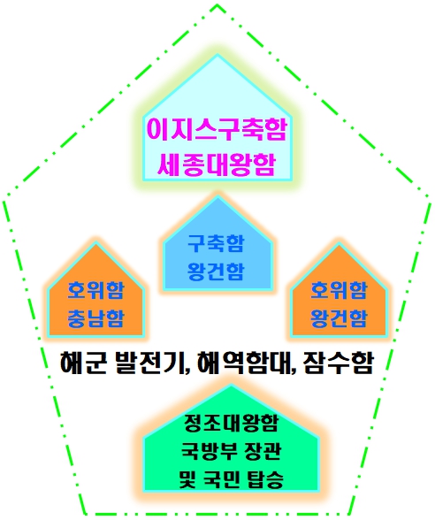 수상함 사열은 해양 3축체계의 핵심인 기동함대 전력을 대표하는 이지스구축함 세종대왕함과 구축함 왕건함이 차례로 기동하며, 최신예 호위함 충남함이 뒤를 잇습니다. 이후 해군 발전기, 해역함대, 잠수함 등 해상 사열이 진행되며 마지막으로 정조대왕함이 국방부장관을 비롯해 국민 2400여명이 탑승한 좌승함과 시승함을 향해 대함경례를 하고 해상사열 종료를 보고합니다.