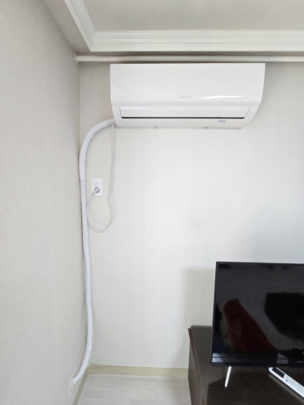 기존 안방과 베란다 벽에는 이미 벽타공이 되어 있어 추가 비용이 들지 않았습니다. 설치기사는 칼블럭으로 벽걸이를 고정한 뒤 냉매관과 전원선을 정리해 테이핑하고, 벽 통과 부분은 에어폼과 실리콘으로 마감해 깔끔하게 마쳤습니다.