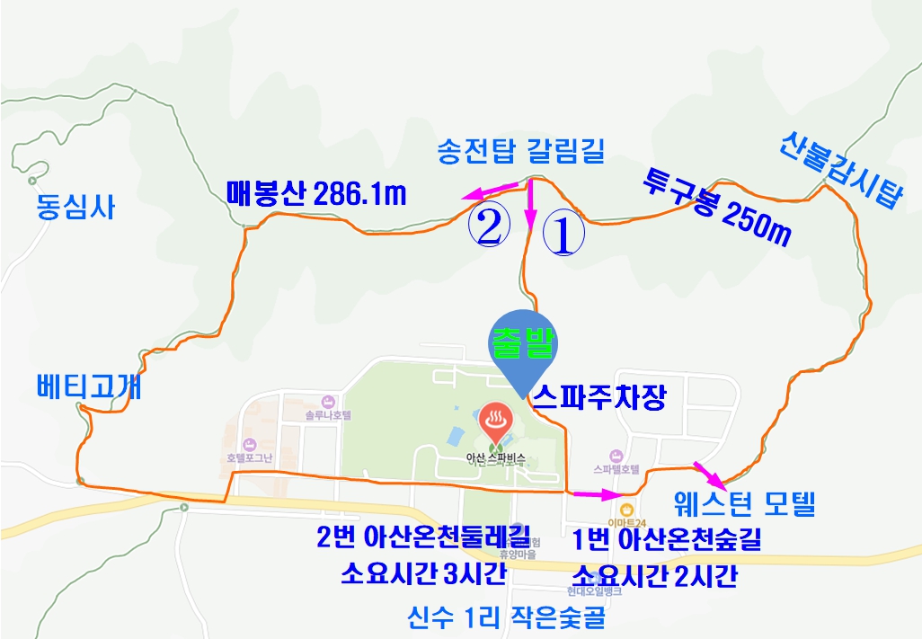 위 지도에서 정식 아산온천둘레길 산행경로인데 참고하세요.