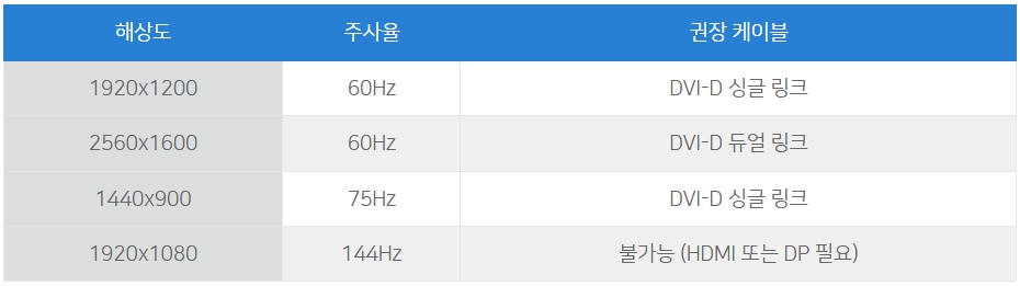 싱글 링크는 FHD 수준에서 제한되며, 듀얼 링크는 QHD 이상도 가능합니다
