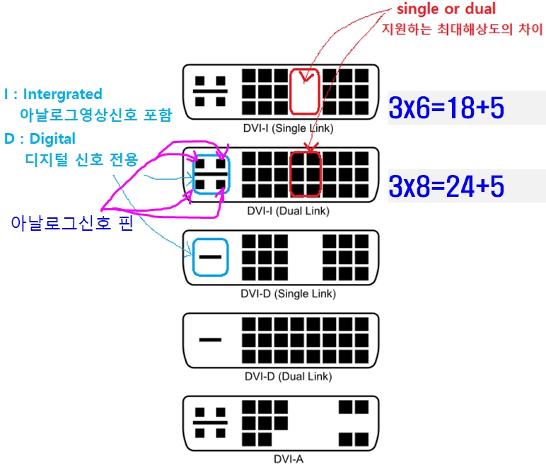 DVI-D : 디지털 신호만 지원 (싱글/듀얼 링크)