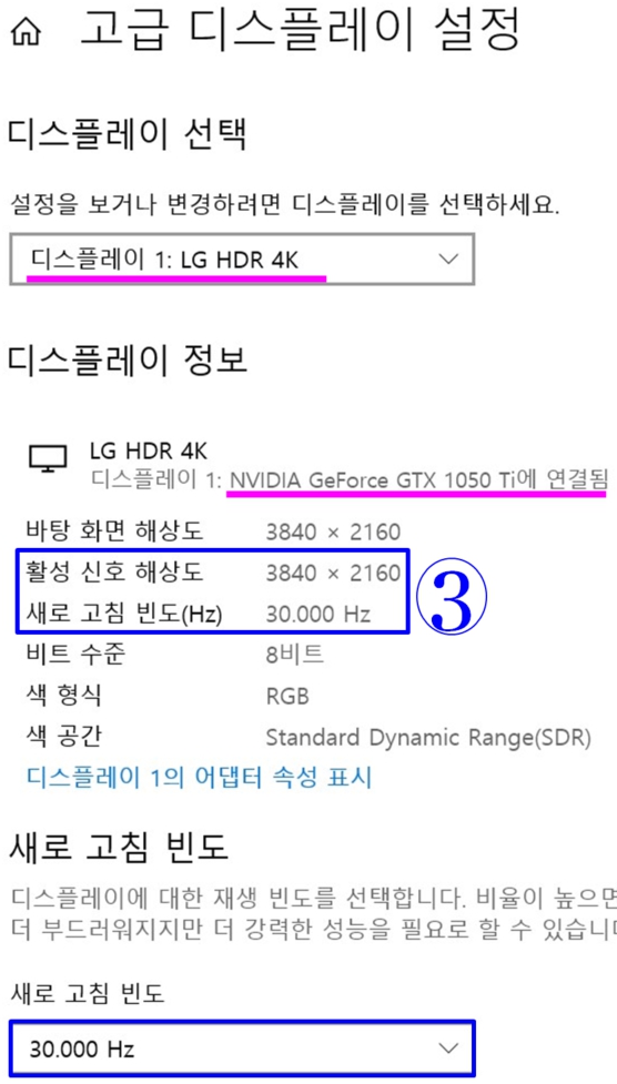 '새로 고침 빈도(Hz) 즉 주사율' 이 30Hz 로 초당 30번 화면을 보여준다는 의미입니다.