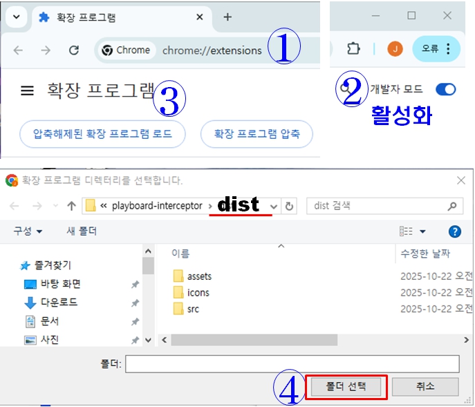 4. 크롬 업로드 — chrome://extensions → 개발자 모드 → dist 폴더 로드