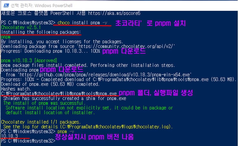 위 이미지는 윈도우 파워셀(Poweshell)에 초코라티( Chocolatey )로 pnpm 설치 명령시 실행되는 내용입니다.