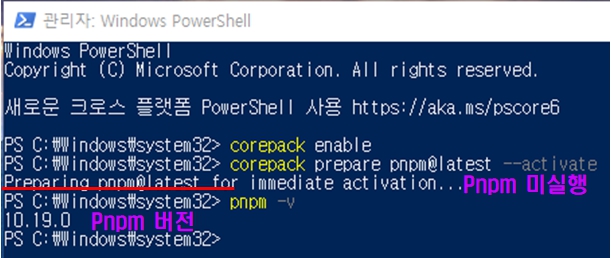 pnpm 설치·실행은 Windows powershell 관리자 모드에서 실행해요.