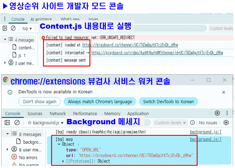 content-script 메시지 송신 background 메시지 수신 정상 |