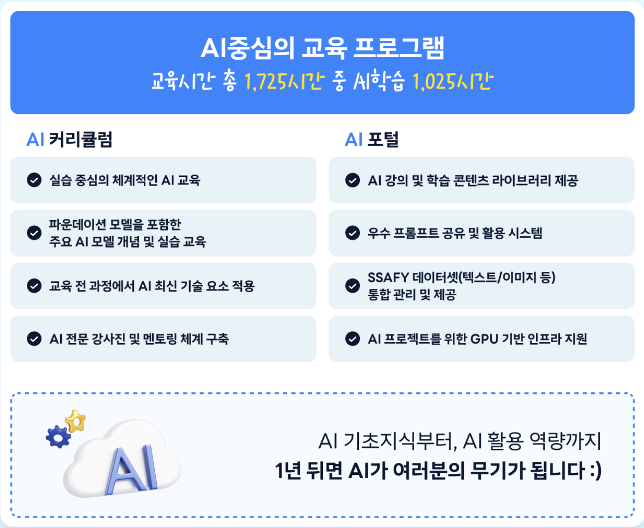 SSAFY는 실무 중심 교육과 AI 기술을 활용한 SW 프로젝트로 차세대 AI 전문 인재를 양성하는 프로그램입니다.