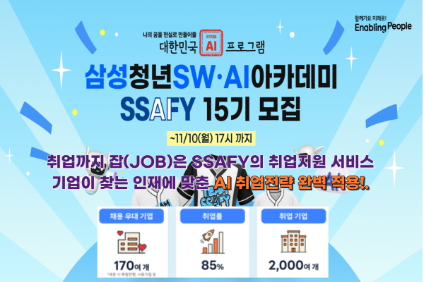 AI 인재로 거듭날 기회가 바로 SSAFY 15기 모집에 있습니다. 지금 바로 지원하여, AI 전문가로서 새로운 길을 열어보세요! 지원 기간은 11월 10일까지입니다.