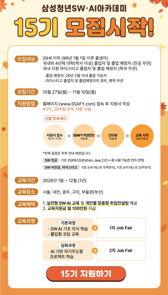 "SSAFY 15기 모집! 실무형 AI 교육과 1년 동안 전액 무상 교육을 받으며, 월 100만원 지원금을 통해 AI 인재로 성장할 기회를 놓치지 마세요. 지원은 11월 10일까지!"