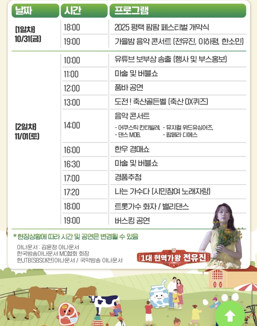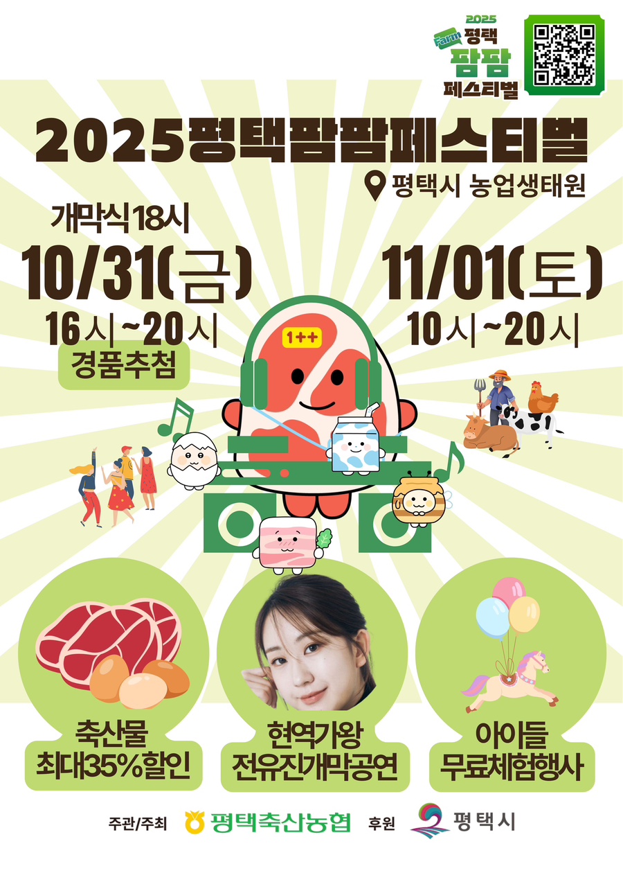 “2025 평택 팜팜 페스티벌에서 즐거운 가족 나들이를! 한우 35% 할인, 다양한 체험 부스, 현역가왕 전유진 공연까지! 평택 농업생태원에서 즐기는 가을 축제와 함께 특별한 주말을 보내세요.”