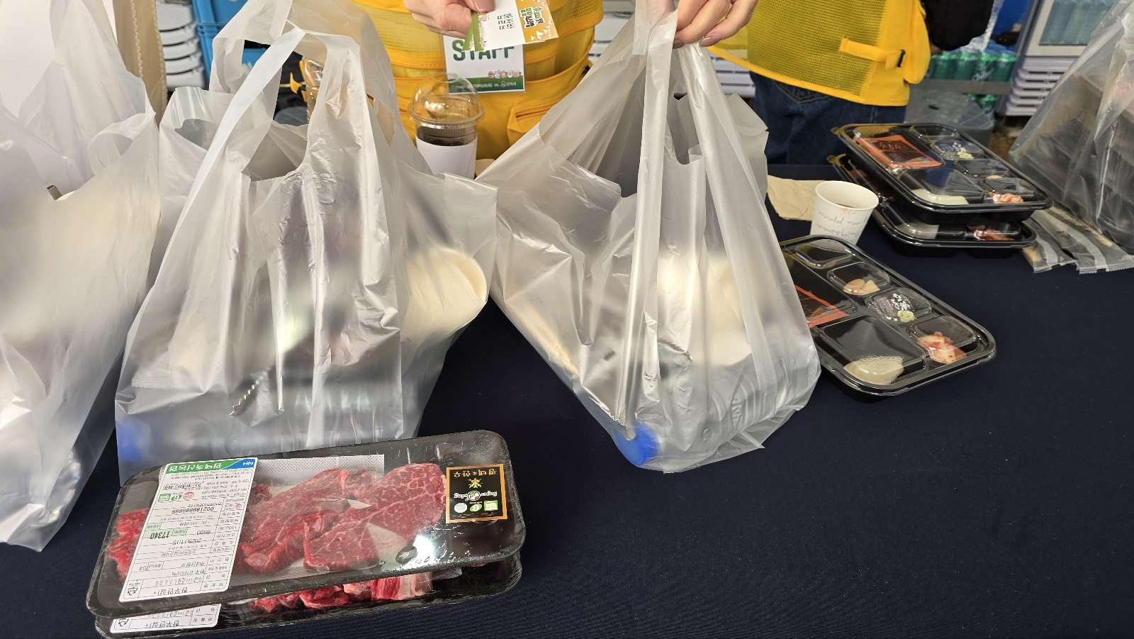 축산 한우판매 장소에 경품 응모함이 있는데 5만원 이상 1장, 10만원 이상 2장 을 받을 수 있어요.