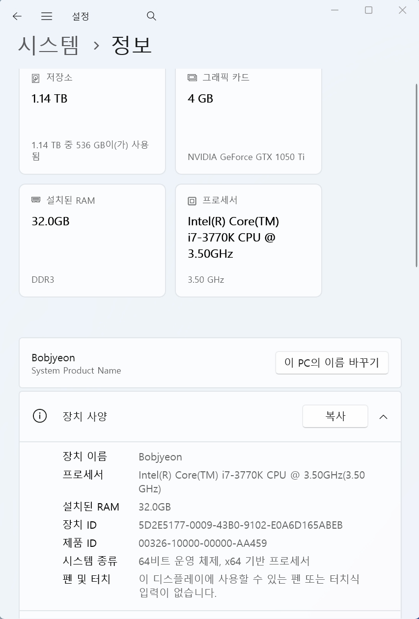 CPU 3세대 교체후 시스템 정보