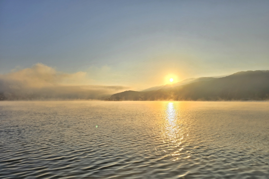 물안개와 반영, 느티나무 실루엣이 어우러진