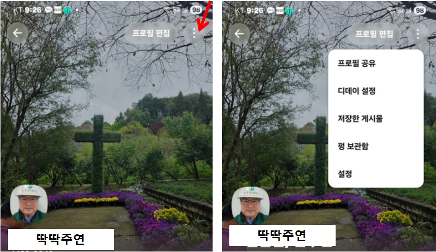 내 프로필 클릭 → 우측 상단 점 3개 → 설정(톱니바퀴) →