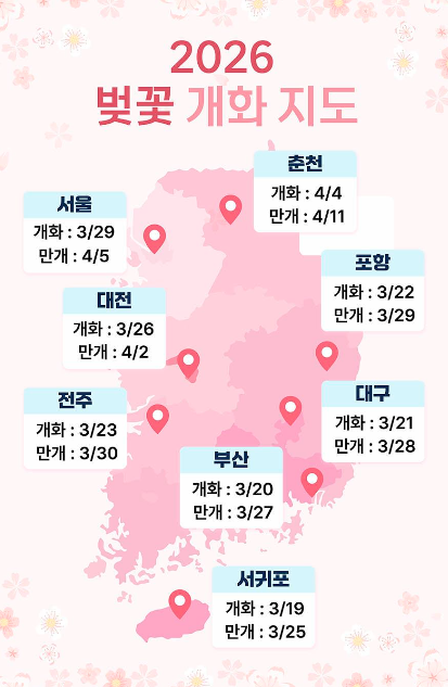 2026 전국 벚꽃 개화시기와 만개시기 총정리! 서울 여의도, 석촌호수부터 진해군항제, 강릉 경포호까지 전국 벚꽃 명소와 벚꽃 축제 일정, 여행 추천 코스를 한눈에 확인하세요. 봄이 다가오면 가