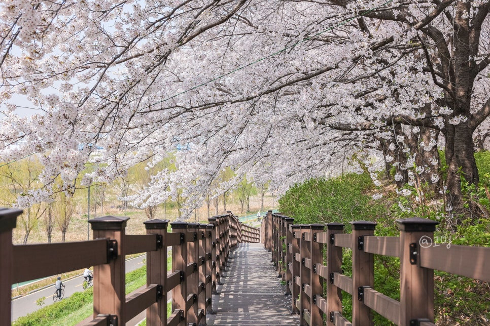 긴 벚꽃 터널이 이어져 있어 자전거 라이딩이나 산책을 즐기기에 좋습니다.